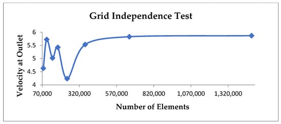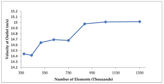 The mesh independence is checked for the pump and eight different cases with regard to. element numbers, which are obtained by changing the element size and global size factor for the volute and impeller, respectively. Element sizes of 15, 20, 25, 30, 35, 40, 45, and 50 mm were applied for the volute in meshing, yielding 330,438, 281,176, 258,746, 248,172, 240,762, 237,168, 234,902, and 232,452 elements, respectively. In contrast, the global size factor was the main parameter that was manipulated for impeller meshing, achieving a range of eight element numbers. Different global size factors for the impeller were assigned in TURBO GRID; the 0.8, 0.9, 1.0, 1.1, 1.2, 1.3, 1.4, and 1.5 sizes produced 141,792, 203,553, 280,080, 385,118, 501,128, 781,482, and 1,019,900 elements, respectively. The output parameter was the velocity at the outlet, which is demonstrated by the mesh independence test shown in Figure 10; 886,386 elements were selected for the simulations, which were produced by a 25-mm element size and a 1.3 global size factor.
