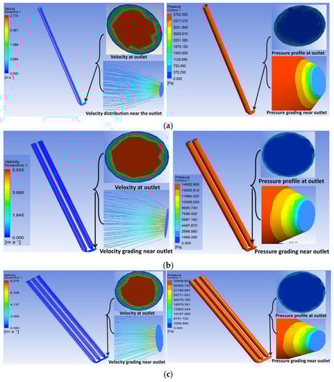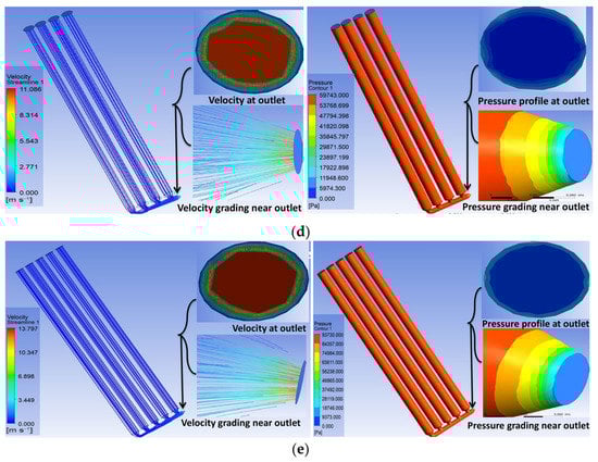 In the experimental design, the dimensions of the PWCs were kept constant, while the number of PWCs was increased individually. The velocity inlet was assigned as the boundary condition at the inlet of the PWCs, whereas the pressure outlet was assigned at the outlet. The velocity and pressure produced in each case, which were processed in CFD-Post, are illustrated in (a)–(e) of Figure 4.