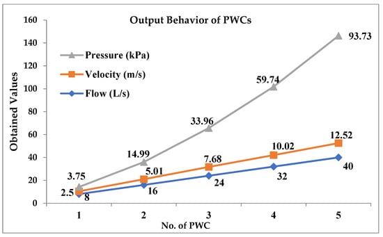 As the number of PWCs is increased according to the demand, the flow is maintained at approximately the designed value, as listed in Table 3.