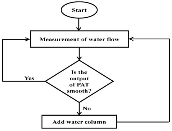 Researchers have adopted various methods to mitigate the adverse effects of flow fluctuations on the output, such as parallel PATs of different capacities, geometrical modifications of a PAT, and power electronics-based variable frequency drives (VFDs). In parallel PATs, when the flow is reduced and a PAT with a large capacity cannot deliver its rated output, it is either manually or automatically turned off. A PAT with a lower capacity is operated to minimize the adverse effects of flow fluctuations. However, the output is reduced by the newly available water flow, and the cost increases owing to paralleling, thereby making the design more complex [,]. Regarding the geometrical modifications of PATs, different researchers have suggested certain design modifications of the impeller [,,,,,,], which better manage the variable flows. However, these modifications are unable to manage all the flow variations, and the cost is increased. Power electronics-based VFDs can provide any speed profile of variable flow inputs [,]. When the flow decreases, which affects the output of the plant, the VFD changes the speed of the generator, and the output of the plant becomes smooth. However, this method is significantly costly because devices with high ratings are required, causing installation, operational, maintenance, and transportation problems.