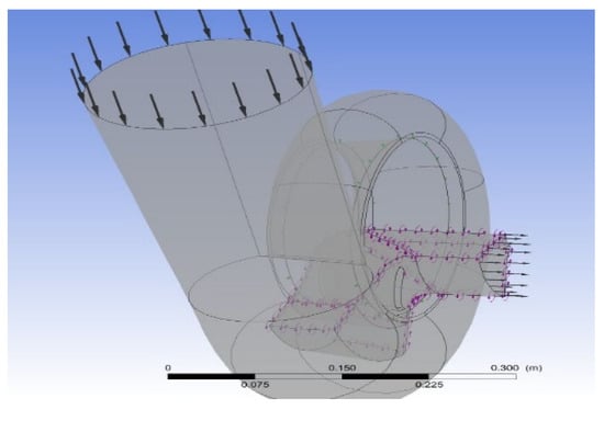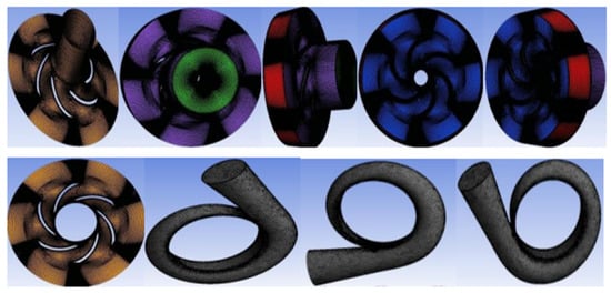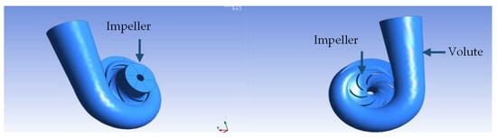 A pump with a flow of 192.1 L/s was designed using the ANSYS (Vista CPD) tool, consisting of a volute and impeller with six blades, as shown in Figure 8. A flow analysis through PAT was conducted in ANSYS CFX [,], in which water was used as the material, and the standard atmospheric pressure was considered to be one atm.