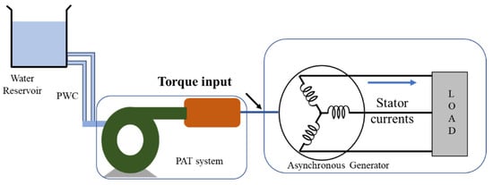 Although a smooth torque is obtained, which ultimately smooths the output of the PAT, in most cases, the PAT and generator are directly coupled. However, a Simulink model was developed to observe the behavior of the generator with variable and smooth torques, as shown in Figure 13.
