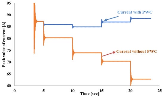 The simulation results of the peak value of the generator current are shown in Figure 15, which demonstrates the variations in the current with respect to the torque obtained from the PAT. In a hydro system, the torque varies with the flow variation. The current depends on the torque value. Therefore, any fluctuation in the flow rate affects the output current of the generator. However, the PWC technique provides a smooth flow, which results in a smooth output.