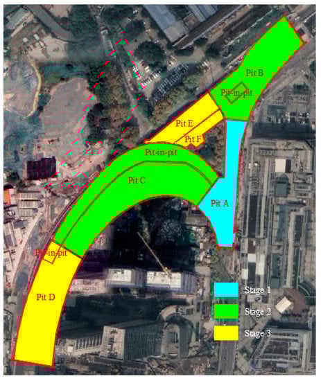 It can be seen from the Figure 1 that the foundation pit group is irregular in shape, similar to an “oil gun”, and there is a small non-excavated area in the middle of the foundation pit group, which increases the construction difficulty. Due to the large traffic flow and the limited construction space, the staged construction technology is adopted to reduce the impact on traffic and nearby buildings and to ensure the safety of the foundation pit itself. The foundation pit group is divided into six independent pits: Pit A, Pit B, Pit C, Pit D, Pit E, and Pit F. Each pit shares a diaphragm wall with the adjacent pit. It should be noted that a pit-in-pit exists in Pit B, Pit C, and Pit D, and the relative depth of the small pit-in-pit is 2.9–8.0 m. In order to reduce the mutual influence during the construction of foundation pit group, it is proposed to arrange six foundation pits into three construction stages. The first construction stage includes the excavation of Pit A. In the second construction stage, Pits B and C are constructed, and the final construction stage involves the excavation of Pits D, E, and F.
