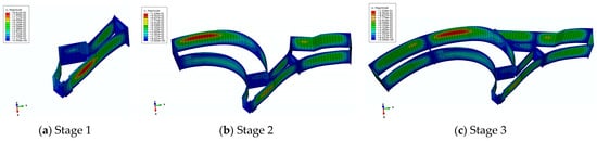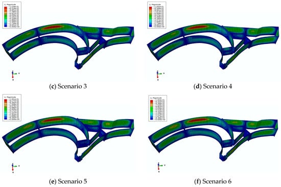 In the different excavation sequences of the foundation pit group, the surrounding soil mass will have different unloading processes, which will exhibit different coupling effects. For a single foundation pit, the excavation area, the excavation depth, and the setting of internal support will have a significant impact on the deformation of the foundation pit. The layered and blocked excavation must be followed, and the internal support must be installed in time without over-excavation. For a complex foundation pit group, these essential instructions are also applicable. The foundation pit group of this project includes six pits, and the construction sequence is an important factor affecting the deformation of the foundation pit. In order to better understand the coupling effect of different construction sequences on the deformation of the foundation pit group, the original construction sequence is changed for simulation to analyze the difference characteristics of the support structure. To facilitate the description of different construction stages, the above names of each foundation pit must remain unchanged and the construction content of each stage must be changed, as shown in Table 6. Figure 7 shows the deformation contour image of the diaphragm wall after excavation in each stage.