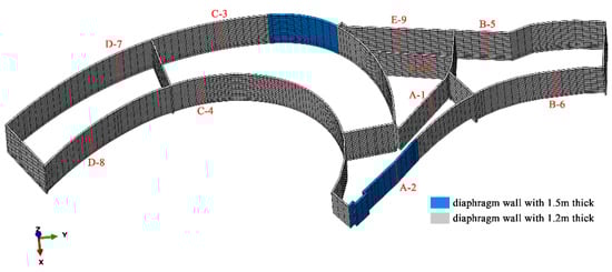 In order to simulate the relative sliding between the diaphragm wall and the soil during the foundation pit construction, the contact interface is set between the wall and the soil. The interface is modelled by the Coulomb friction law. The interface friction is equal to the friction coefficient multiplied by the normal effective stress between two contact surfaces. The friction coefficient can be calculated by the interface friction angle and the interface friction angle can be evaluated by the friction angle of soil []. It is assumed that limiting shear displacement of 5 mm is used to realize the full adjustment of the interface friction []. The friction coefficient of the contact surface is estimated to be 0.3.
