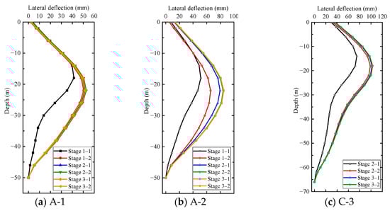 It can be seen from Figure 5a,b that from Stage 1–2 to Stage 2–2, the maximum lateral displacement at A-1 increases from 50.36 mm to 52.77 mm, with an increase of about 4.8%. In addition, the maximum lateral displacement at A-2 increases from 65.71 mm to 84.22 mm, with an increase of about 28.2%. It can be concluded that the process of Stage 2 has a greater impact on the displacement of the diaphragm wall at A-2. As the excavation and unloading takes place in Pit B, the soil outside moves toward the pit, driving the soil at A-2 to move toward Pit A. The position of A-2 is close to the existing building, making the soil at A-2 more susceptible to disturbance. Thus, the earth pressure on the diaphragm wall at A-2 increases, making the lateral displacement increase rate of A-2 larger. A-1 is located between foundation Pit B and Pit C, and the excavation of Pit C makes the soil outside tend to move toward Pit C, causing the soil at A-1 to unload to some extent. Therefore, the increase rate of lateral displacement at A-1 is smaller. From Stage 2–2 to Stage 3–2, the maximum lateral displacement at A-1 decreases from 52.77 mm to 51.01 mm, decreasing by about 3.3%. The maximum lateral displacement at A-2 increases from 84.22 mm to 85.11 mm, increasing by about 1%. Since Pit D is far from Pit A, the excavation in Pit D has little impact on lateral displacement at A-1 and A-2.