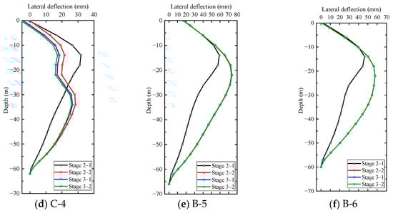 It can be seen from Figure 5c–f that, from Stage 2–2 to Stage 3–2, the maximum lateral displacement at C-3 increases from 98.9 mm to 102.9 mm, with an increase of about 4%, and the maximum lateral displacement above the excavation surface at C-4 decreases from 20.2 mm to 16 mm, with a decrease of about 20.8%. The excavation of Pit D drives the soil mass at C-3 to move toward the pit, resulting in the increase in earth pressure at C-3 and the increase in the lateral displacement of the wall. However, C-4 is close to the shared diaphragm wall of Pit C and D, and both sides of the shared diaphragm wall are braced with diagonal supports. Thus, the lateral displacement at C-4 is affected by the great stiffness of the diagonal supports, showing the trend of moving away from Pit C. The process of Stage 3 has little effect on the lateral displacement at B-5 and B-6. Although B-5 is close to Pit E, the shared diaphragm wall of Pit E and Pit B limits the displacement of the wall near B-5. Moreover, the excavation area of Pit E is small, so the impact of excavation can be ignored.