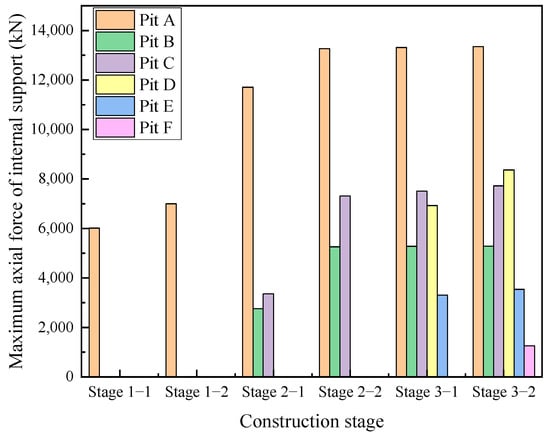 It can be seen from Figure 6 that the maximum axial force of the support in Pit A is always far greater than that in other pits in each construction stage. After the excavation of all foundation pits, the maximum axial forces of the supports in Pit A–Pit F reach 13,350 kN, 5286 kN, 7723 kN, 8365 kN, 3540 kN, and 1257 kN, respectively. As the minimum width of Pit A is only 13.5 m, the internal supports have a strong supporting effect. In addition, Pit A is close to a building, which makes the axial force of the internal support in Pit A larger, always exceeding that in other pits in the subsequent construction stage. After Stage 2 excavation, the maximum axial force of support in Pit B is always less than that in Pit C. The excavation depth of Pit B is 22 m, and the pit-in-pit is located in the middle with a small excavation area. In contrast, Pit C is a large excavation area with a curved shape, and the excavation depth is 23.8 m. The pit-in-pit in Pit C is close to the diaphragm wall with a large excavation area. Therefore, the supports in Pit C have greater axial forces. Similarly, the maximum axial force of the support in Pit D is always greater than that in Pit E. The excavation depth of Pit F is the shallowest, only 4.5 m, so the maximum axial force of support is the smallest.