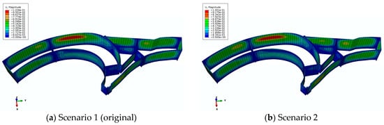 It can be seen from Figure 8c,d that the maximum lateral displacement of the diaphragm wall at C-3 is about 103 mm in Scenarios 1, 3, and 4, and the maximum lateral displacement is about 100 mm in Scenarios 2, 5, and 6, with a difference of 3%. In Scenarios 1, 3, and 4, the maximum lateral displacement of the diaphragm wall at C-4 is about 26 mm, and the maximum lateral displacement is about 30 mm in Scenarios 2, 5, and 6, with a difference of 15.4%. Thus, the maximum lateral displacement at C-3 and C-4 cannot reach the minimum value at the same time in the six scenarios; that is, there is no optimal scenario.