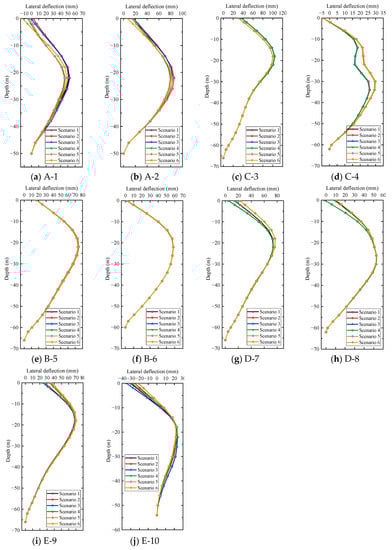 It can be seen from Figure 8i,j that the maximum lateral displacement of the diaphragm wall at E-9 is about 69 mm in Scenarios 1, 2, and 3, and the maximum lateral displacement is 70.6 mm in Scenario 6, increasing by 2.3%. Thus, the excavation of Pit A before Pit E will help control the lateral displacement of the diaphragm wall at E-9. The maximum lateral displacement of the diaphragm wall at E-10 is about 21.5 mm in Scenarios 5 and 6 and about 23.8 mm in Scenarios 1 and 3, with a difference of 10.7%. Therefore, the maximum lateral displacement at E-10 is mainly related to the excavation process of Pit E. When Pit E is excavated in Stage 1, the maximum lateral displacement at E-10 will be the minimum, and vice versa.
