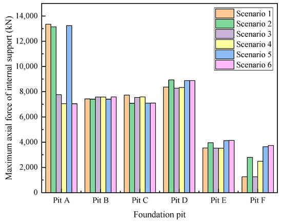 Figure 9 shows the maximum axis force of internal support in each foundation pit under different construction sequences. It can be seen from the figure that the construction sequence of the foundation pit group has the greatest impact on the maximum axial force in Pit A. In Scenario 1, the maximum axial force in Pit A is 13,350 kN, and the minimum is 7045 kN in Scenario 6, with a difference of 89.5%. Therefore, the excavation of Pit B and Pit C has the most obvious impact on the maximum axial force in Pit A, while the excavation of Pit D, Pit E, and Pit F has little impact.