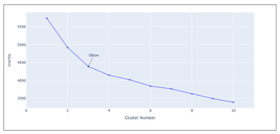 K-means clustering is used for this study. The decision of the cluster number is based on the inertia and the “elbow rule”. Therefore, using that method, the elbow seems to be between three to five, as shown in Figure 2. For this research, the number of clusters decided is three. After clustering, to determine if the three clusters of data have a significant difference between the mean value, we applied one-way ANOVA for statistical analysis. One-way ANOVA was performed using python’s function from the SciPy library.