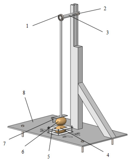 Single pendulum friction test device. 1. Rolling bearing. 2. Adjusting nut. 3. Supporting shaft. 4. Friction material. 5. Fixture 1. 6. Potato. 7. Fixture 2. 8. Test bench support.
