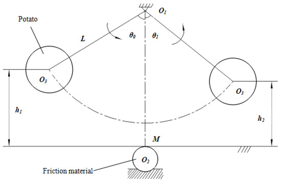 During the process of the potato contacting the friction materials, the energy loss caused by friction inevitably changes the swing angle and height before and after potato friction, and this energy loss ratio was taken as an index to evaluate the energy loss due to friction. The energy loss of the single pendulum itself during a swing was ignored for its mass was much smaller than that of potato [23]. Figure 4 shows the position of the potato before and after contact with the friction material. The potato was released after lifting to height h1 at the beginning of the experiment; it then rubbed against the friction material in the lowest position and continued to swing forward to the highest position h2.