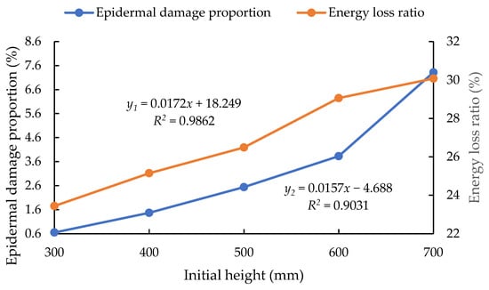 Relationship between initial height and evaluation indexes. Note: The standard deviation range for the proportion of epidermal damage is 0.1–0.5, and the standard deviation range for the energy loss ratio is 2–6.