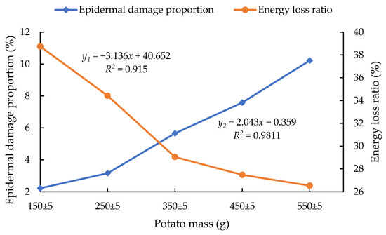Relationship between potato mass and evaluation indexes. Note: The standard deviation range for the proportion of epidermal damage is 0.5–1, and the standard deviation range for the energy loss ratio is 3–7.