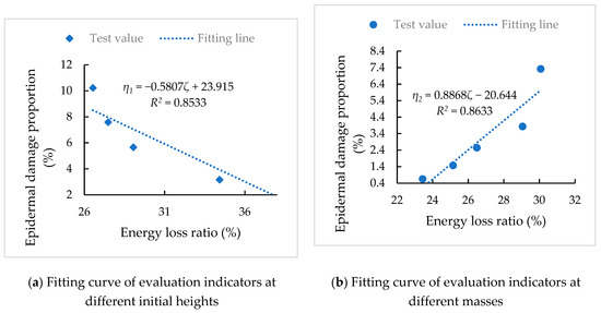 The proportion of epidermal damage is significantly related to the energy consumption loss ratio under different initial heights and potato mass conditions from the above analysis. Hence, to predict the proportion of potato epidermal damage under different experimental conditions, a regression model between the proportion of epidermal damage and the ratio of energy consumption loss was constructed. The data points and fitted lines are shown in Figure 9, and the linear regression equation and correlation coefficient are as follows: η1 = −0.5807ζ + 23.915 (R2 = 0.8533); η2 = 0.8868ζ − 20.644 (R2 = 0.8633).