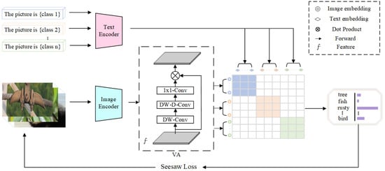 Our model has only one stage, saving a significant amount of processing time relative to two-stage models, and works well with imbalanced data. The primary process is as follows. We pretrained the model on the original unbalanced dataset and obtained language and visual expressions through comparative learning. Then, the large convolution kernel was split into three parts to generate an attention map and weigh the original image; this approach can better recognize the importance levels of different channels and ignore irrelevant parts []. This operation can save computational resources and estimate each channel’s importance when obtaining long-distance dependence, which is equivalent to combining the advantages of self-attention and squeeze-and-excitation (SE) attention []. A seesaw loss replaced the cross-entropy loss to better balance the two modules and long-tailed data []. Finally, classification results were obtained by matching the output text expression and image features using cosine similarity.