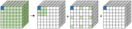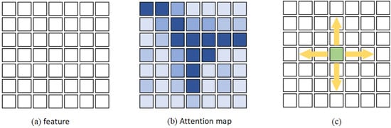 As shown in Figure 3, the large convolution kernel is split into three operations that can reduce computational expense and generate long- and short-distance dependencies without self-attention []. One large kernel convolution, for example, can be broken down into a depthwise convolution, a depthwise convolution, and a 1 × 1 pointwise convolution. According to the obtained attention map, the importance of each point can be judged, and the attention formula can be simplified as follows: