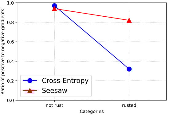 During the ResNet training process on the clamp dataset [], we can determine the distribution of the cumulative gradients of positive and negative samples imposed on each class of classifiers, as shown in Figure 4. The positive-to-negative sample gradient ratio is close to 1.0 for the rust category and is very small for the rare rust label. As the quantity of samples decreases, the classification accuracy dramatically decreases, impacting the model performance. However, the seesaw loss can obtain better outcomes by more effectively balancing the positive and negative gradient ratios.