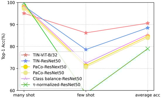 Vision-based deep learning models have made remarkable progress in recent years in areas including object detection [,,], semantic segmentation [,], and image classification [,,]. However, long-tailed recognition (LTR), as a classification branch, has long puzzled scholars []. As classification problems in the real world tend to exhibit long-tailed imbalanced distributions, most labels are associated with only a few samples [,]. Models trained on these datasets accrue more gradients and slant the outcomes toward dominant labels, resulting in poor results belonging to fewer sample categories.