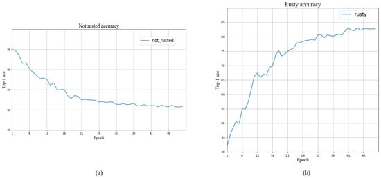 (a) Figure shows the accuracy of the unrusted (Many) category; (b) Figure shows the accuracy of the rusty (Few) category.