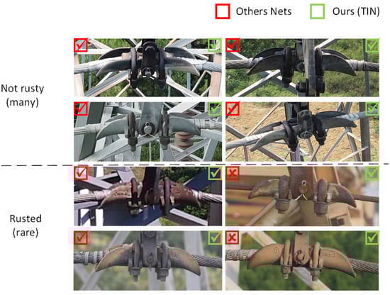 Finally, we visualized the classification results, as shown in Figure 8. Our model was shown to be more accurate in the identification of rare classes than other algorithms. The recognition accuracies of other algorithms are seriously affected when the parts near the clamp are rusted, but the TIN always produces correct recognition results.