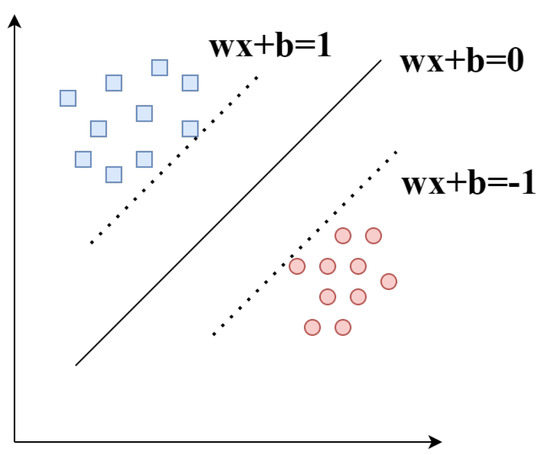 As shown in Figure 1, the margin refers to the sum of vertical distances from sample points of different classes on both sides of the hyperplane to the hyperplane. The process of finding the desired hyperplane is the process of finding the maximum margin. The reason it is necessary to maximize the margin is to enhance robustness and minimize the error rate of the classification. The two sample points that determine the maximum margin are called support vectors, which is also the origin of the name of support-vector machine.