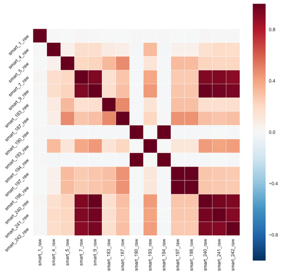 As can be seen from the results obtained in Table 7, the model generalizes well, and compared with the model obtained by the ensemble learning method, the results of the traditional machine learning or deep learning models, such as random forest, the BP neural network, and LSTM, show poor robustness. The most obvious improvement of the LSTM on the blending method is the experiment on a hard disk from the Hitachi manufacturer. It is worth mentioning that the S.M.A.R.T. feature sets filtered out by Hitachi hard disks have a large gap compared to those of Seagate, so the initial performance is poor. However, since the vast majority of S.M.A.R.T. features are the same for different models of hard disks, aligning the features after comparing previously obtained heatmaps (as shown in Figure 6) can greatly improve the test results. Therefore, when testing other models of hard disks, the most important thing is to align the features with high correlation among the selected features, so that good results can be obtained.