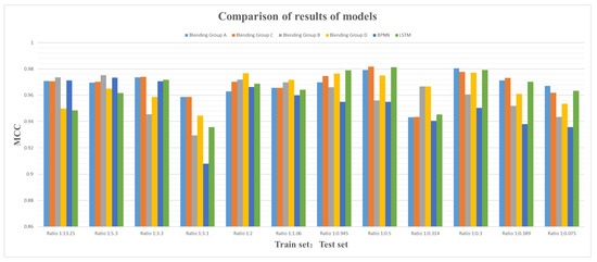 In addition, to further verify the rationality of the blending ensemble learning method, we added LSTM to the base learners to obtain better effects and criterion. We set up two additional experimental groups by removing the classifier with the least stable classification effect or least impact on the final result from the base learners of the original two groups of Blending experimental groups and replacing it with LSTM, thus obtaining Blending group C and Blending group D, respectively. Based on the observation and analysis of the intermediate results in the experimental process, we replaced the XGBoost in the base learner of blending group A with LSTM and the Gaussian Naive Bayes classifier in the base learner of blending group B with LSTM, thus obtaining two new ensemble learning models. Table A1 and Table A2 in the appendix give the parameter values of some algorithms, and the algorithms not mentioned use default parameters.
