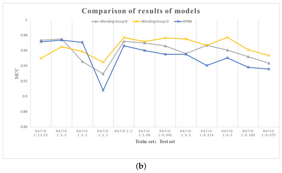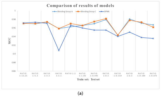 From the experiment results, we can see that the blending ensemble learning method has significantly improved the evaluation criterion. In most experimental groups, LSTM model experimental results are better than using BP neural networks alone but not better than blending ensemble learning methods. In addition, from the results in Table 4, in most cases, it can be seen that LSTM, when added to the base learner, can significantly improve the performance. The line chart in Figure 11 more clearly shows the effect changes after the addition of the LSTM to base learners, which proved the effectiveness of this method. However, it should be noted that there are cases in which the LSTM model has the best effect in some individual experimental groups. We guess that under such dataset processing, if the ratio of the training set to the test set is too large or too small, the performance of the LSTM model will be poor or the results will not be accurate. Because the total amount of datasets is fixed, when the proportion of training sets is too large, the number of test sets is too small, which will lead to the insufficient persuasiveness of test results. In contrast, when the proportion of test sets is large, too few training sets will result in insufficient model training. When the ratio is between 1:1 and 1:0.5, the performance of the LSTM network can be maximized, and when the ratio is around this, the effect of the model is more in line with expectations. However, this conclusion is only a guess and needs to be verified by subsequent experiments.