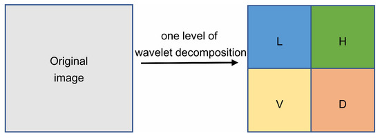 One level of wavelet decomposition. L, H, V, D represent low-frequency coefficient, horizontal high-frequency coefficient, vertical high-frequency coefficient and diagonal high-frequency coefficient.