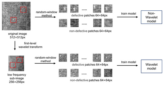 The dataset used in this approach is weakly labelled, and CNN can automatically extract and learn the features from the image, so the CNN network is applied in this work. In view of the previous work [1,2,3], because of the great differences between the background texture in the dataset, researchers have to use a lot of data to train the CNN network. However, In the field of deep learning, a large amount of training data is often difficult to get. Additionally, it will not only greatly increase the training time, but also the overall computation. To solve the above problems, this approach uses wavelet transform in the data preprocessing phase. The low-frequency part obtained after the image wavelet transform is the compression of the original image, which is only a quarter of the size of the original image, but the defects in the original image are still visible. Using small images can speed up model training and save resources. In order to speed up the training speed, reduce the training data and improve the detection accuracy, this approach uses the information in the wavelet domain as model input. In the model training phase, in order to overcome the challenge that the defect area is small, this paper proposes a random-window method to extract patches from the training images, and then uses the patches to train the CNN network. In the defect detection phase, this paper uses the sliding-window method and judgment strategy to solve the problem of background interference. First, we extract patches from the image to be detected using the sliding-window method. Then, all the patches are sent to the CNN network to judge whether there are defects. Finally, after considering the defect condition of the original image, the step of the sliding-window and other factors, we set a threshold. When the number of defective patches exceeds the threshold, the image is considered defective. By adjusting the threshold to find the best average accuracy, the best threshold is determined. Figure 4 and Figure 5 show the process of this approach in the model training phase and defect detection phase, respectively.
