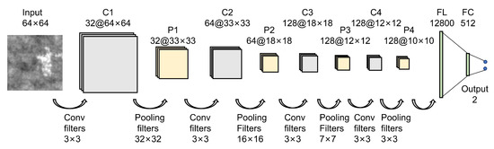 As shown in Figure 6, an 11-layer convolutional neural network is designed. The input of this network are patches, which come from the training image. The size of the patch is 64 × 64 pixels. The kernel size of each convolutional layer is always 3 × 3, and each convolutional layer is followed by a pooling layer. The size of the pooling filters decreases from 32 × 32 to 3 × 3, and the pooling strategy adopted in all the pooling layers is max-pooling, which can learn the edge and texture structure of the image. In addition, to keep the shape of the feature map, we apply the zero-padding strategy after each convolution. Finally, the dimension of the last fully connected layer is 2. The value of the output represents the probability of a defective image and a non-defective image, respectively.
