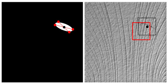 Label image (left) and defect image (right) in DAGM. The black spot is the center of the defect, the red rectangle is the defect patch we extracted after offset.