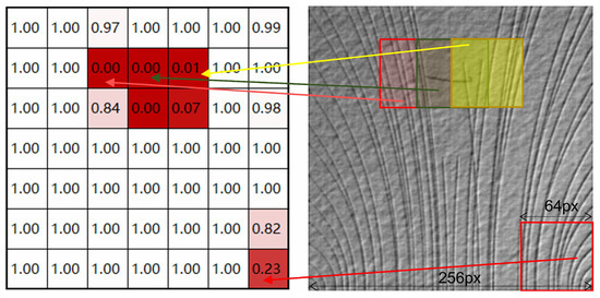 A defective image (right) and its probability matrix (left). The number in the box indicates the probability that the patch is non-defective.