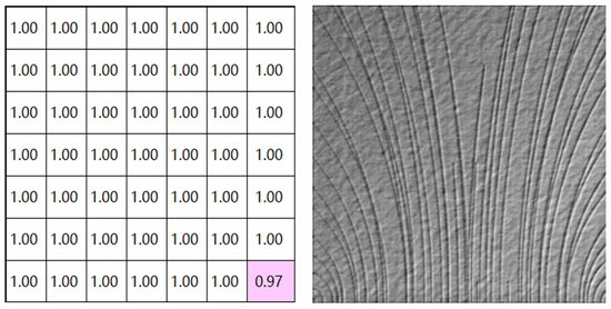 If the prediction probability of 0.5 is used as the threshold to distinguish defective images from non-defective images, it can be found that the element in the lower right corner of the probability matrix of Figure 9 is 0.23, which means the CNN model predicts the patch is defective. However, as you can see from the right image in Figure 9, the patch in the lower right corner is non-defective. In our judgment strategy, the prediction error of a few patches will not affect the final judgment. Because of the overlap in the process of extracting patches by the sliding-window method, at least four defective patches are extracted from each defect area in DAGM. In the judgment strategy of the defect detection stage, a threshold can be determined by comprehensively considering the size of the defect area, the accuracy of model, the step of the sliding-window and other factors. When the number of defective patches is greater than the threshold, it is considered that the image to be detected is defective. Under this strategy, the defect detection method is robust to background interference. Figure 10 shows a non-defective image and its probability matrix as a comparison.