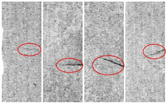 The KolektorSDD dataset [40] contains 50 folders, each containing about eight images of metal surfaces with their corresponding labels. The entire dataset has 399 images, of which 52 are defective and 347 are non-defective. The image’s width is 500 pixels, and the height varies from 1240 pixels to 1270 pixels. A partial image of the dataset is shown in Figure 13, where the defect area is marked with a red ellipse. Most of the defects in this dataset are obvious, but there are many fine-grained spots in the image, which are easy to interfere with defect detection. In addition, there are only 52 defective pictures, which is less than the non-defective data. Thus, the data enhancement is required.
