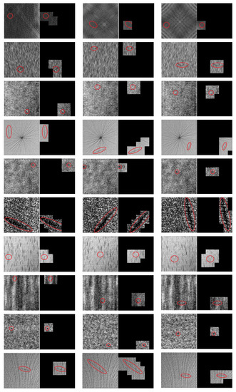The micro-surface defect database was collected by Song et al. [39]. There are two classes of images in this dataset, where one is called the spot-defect image (SDI) and the other is called the steel-pit-defect image (SPDI). There are 20 images in the first class and 15 images in the second class, where some images may contain more than one defect. The image samples of this dataset with a size of 640 × 480 pixels are shown in Figure 12, where the defect area is marked with a red ellipse. In the silicon steel strip, the spot-defect is one of the most common defect types in the micro-surface defect, and the defect in SDI is only 6 × 6 pixels. As for SPDI, the defect is a strip-shaped hollow, and the defect area is relatively bright. It can be found that there are many strong interferences in the background of this kind of image.