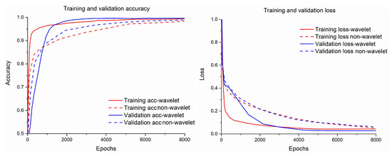 To show the high efficiency of this approach, we trained the wavelet and non-wavelet models for each class of the DAGM2007 dataset under the same parameters. Here we take the class 10 images as an example. Figure 15 shows the accuracy curve and loss curve of the wavelet model and non-wavelet model during the training process. It can be found that the wavelet model is better than the non-wavelet model in accuracy and learning speed.