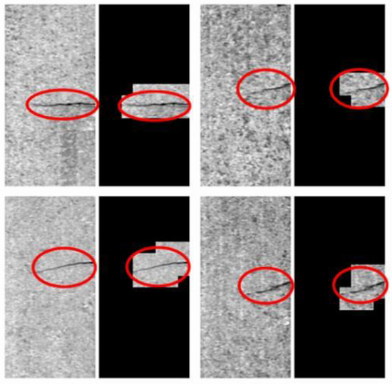 Figure 14 illustrates our detection results of this method. The non-defective areas are covered by the black image in the results. It should be noted that the step of the sliding-window method in the detection phase is 32 px, which is less than the size of patches 64 px, so some areas of the image to be detected may be judged as both defective and non-defective at the same time. The results shown in Figure 14 consider the above situation as defective. It can be found that this method can detect small defects in the image with large texture differences in the background, and also can roughly determine the location of the defects.