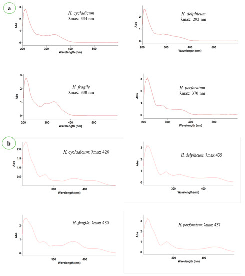 (a) UV-Vis spectra of H. cycladicum, H. delphicum, H. fragile, and H. perforatum extracts. (b) UV-Vis spectra of H. cycladicum, H. delphicum, H. fragile, and H. perforatum extracts after complexing with AlCl3 reagent.