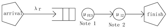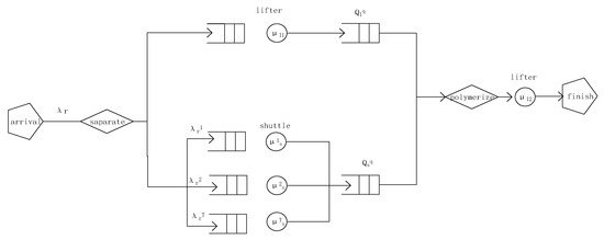- At , the hoist completes its operation and reaches the convergence point. This process requires the shuttle to complete the pickup operation and move to the entrance of the aisle; then, the service rate of this process is .