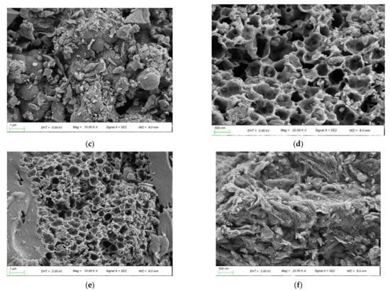 Surface morphology and microstructure of activated carbon: (a,b) pristine activated carbon; (c,d) L. hexandra CW-MFC anode biofilm; and (e,f) L. hexandra CW-MFC cathode biofilm.