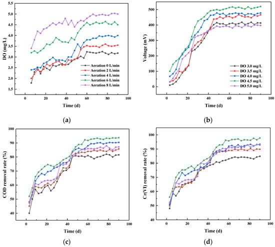 Removal rates of pollutants and electricity production in the L. hexandra CW-MFC system at different dissolved oxygen (DO) concentrations: (a) DO concentration at different aeration rates; (b) voltage at different DO concentrations; (c) chemical oxygen demand (COD) removal rate at different DO concentrations; and (d) Cr (VI) removal rate at different DO concentrations.