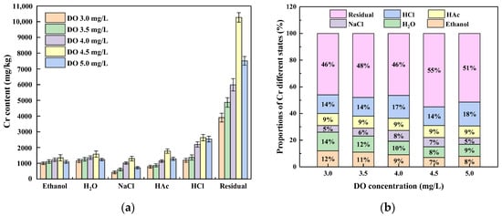 All forms of Cr content reached the maximum residual state (10,273.44 mg·kg−1), HCl extraction state (2626.25 mg·kg−1), H2O extraction state (1577.75 mg·kg−1), ethanol extraction state (1344.31 mg·kg−1), HAc extraction state (1771.19 mg·kg−1), and NaCl extraction state (1296.69 mg·kg−1) at 4.5 mg·L−1 (Figure 5). The proportion of the residual state increased to the maximum, accounting for 55% of the total. This indicated that the increased DO concentration contributed to the transformation of Cr to a stable state.