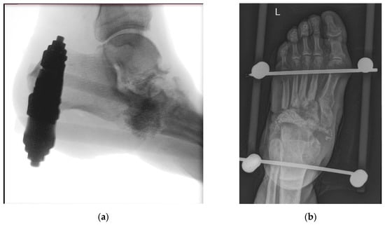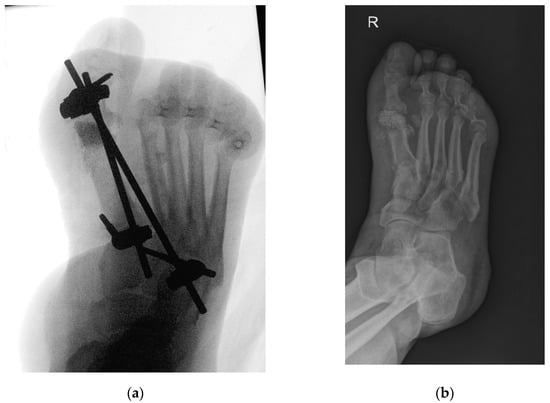 (a) Intraoperative X-ray—resection of 1st metatarsophalangeal joint, placement of bioactive glass granules, and placement of external fixation device. Image captured intraoperatively with diascopy using Siemens Cios Alpha® (Siemens, Munich, Germany) (average exposition parameters: 50 kV, 0.05 mAs, and 5 fps); (b) patient three months after resection of 1st metatarsophalangeal joint and bioactive glass insertion. Image captured with Philips Digital Diagnost® (Philips, Amsterdam, The Netherlands) (exposure parameters: 70 kV and 2 mAs).