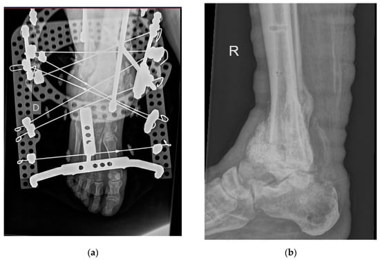 (a) Patient after insertion of bioactive glass granules and putty (malleolus) with an Ilizarov external fixation device. Image captured with Siemens Polydoros SX80® (Siemens, Munich, Germany); (b) patient after removal of Ilizarov external fixation device (eight months after insertion of bioactive glass granules and putty). Image captured with Philips Digital Diagnost® (Philips, Amsterdam, The Netherlands) (exposure parameters: 68 kv and 4 mAs).