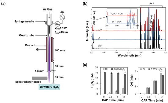 Schematics and OES of the CAP; (a) The Ar plasma plume is generated between a syringe needle and Cu-pad and ejected from the quartz tube; (b) OES of the CAP plume in the range of 200–900 nm when plume was ejected to dry air (‘CON’), to water surface (‘DI’), and to 1% H2O2 surface (‘H2O2′). Inlet graphs show the differences in OES intensities between H2O2 or DI and CON; (c) Measurements of (a) OH· and H2O2 in the CAP treated DI or 0.05% H2O2 solution according to exposure time.